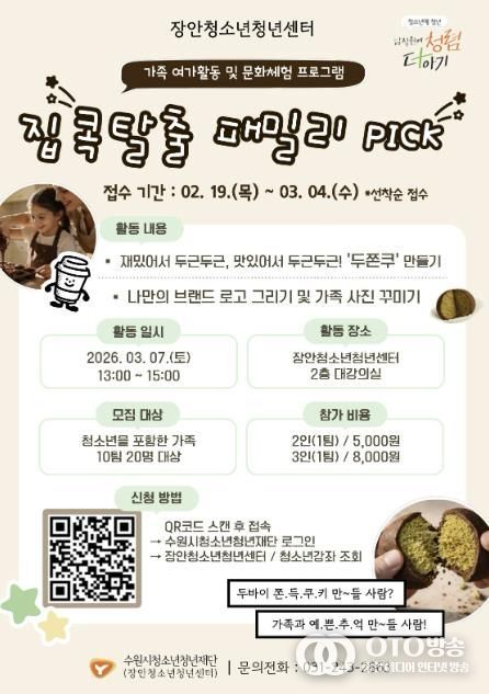 장안청소년청년센터 관계자는“이번 활동을 통해 직접 만들어보는 즐거움과 가족과 함께하는 시간을 경험하며, 더욱 맛있고 신나는 추억이 되도록 많은 참여 부탁드린다.”라고 말했다.