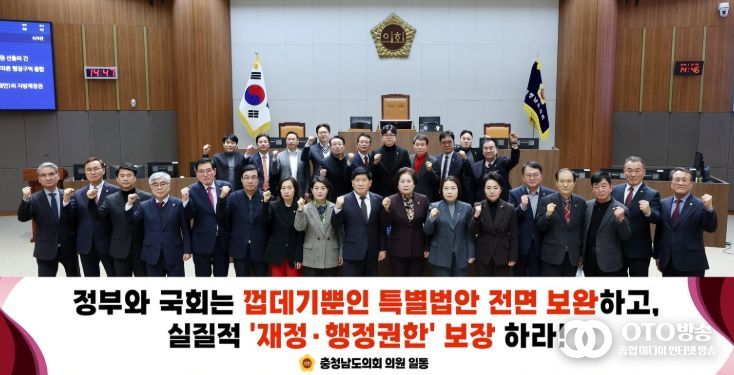 oto방송 김민석 기자 | 충남도의회가 현재 추진 중인 충남·대전 행정통합과 관련해, 통합특별시의 자립적 성장을 위한 재정권과 자치권이 결여된 특별법안을 강하게 비판하며 실질적인 권한 강화를 촉구하고 나섰다.