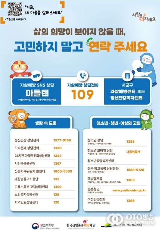 특히 주민들이 위기 상황에서 즉시 도움을 받을 수 있도록 상담기관 안내를 적극 홍보하며 우울감이나 무기력감, 극심한 스트레스 등으로 어려움을 겪고 있는 경우 혼자 고민하지 말고 즉시 도움을 받아야 한다고 당부했다.