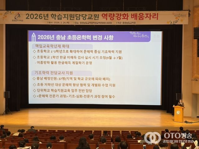 oto방송 김민석 기자 | 충남교육청은 26일 충남교육청학생교육문화원(천안)에서 2026년 학습 지원 담당 교원 410명과 14개 시군 교육지원청 기초학력 담당 장학사를 대상으로 배움자리를 개최했다.