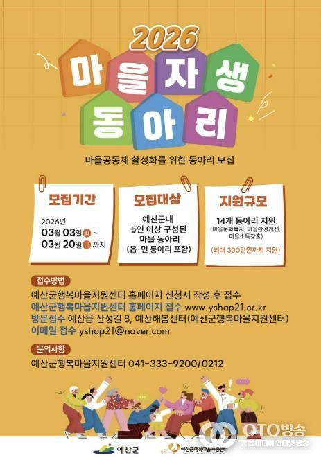 oto방송 김민석 기자 | 예산군행복마을지원센터는 마을에 활력을 불어넣고 마을공동체 회복을 도모하기 위해 2026년 마을자생동아리를 3월 20일까지 모집한다고 밝혔다.