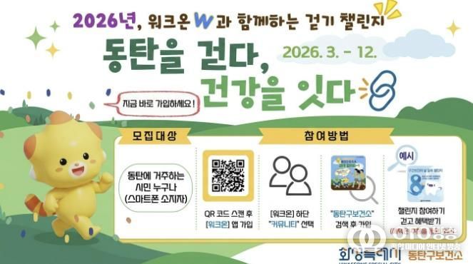 이번 사업은 모바일 걷기 앱 ‘워크온(WalkON)’을 활용해 진행된다. 스마트폰을 사용하는 동탄구 주민이라면 누구나 무료로 참여할 수 있으며, 앱 설치 후 ‘동탄구보건소 공식 커뮤니티’에 가입하면 다양한 걷기 챌린지에 참여할 수 있다.