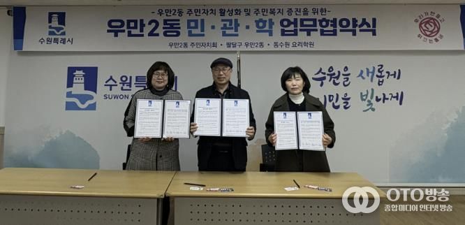 oto방송 김민석 기자 | 수원시 팔달구 우만2동 주민자치회는 지난 10일, 우만2동‧동수원요리학원과 함께 협력사업 추진을 위한 민‧관‧학 협약을 체결했다.