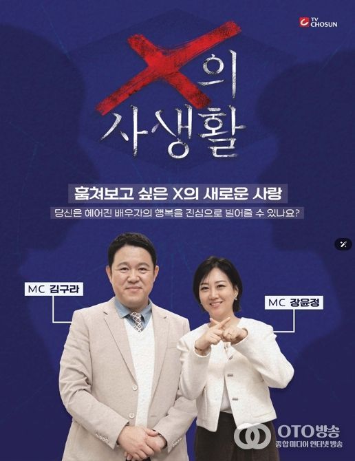 오는 3월 17일(화) 밤 10시 첫 방송되는 TV CHOSUN ‘X의 사생활’은 이혼한 전 배우자의 일상을 지켜보는 리얼 관찰 프로그램이다. 한때는 누구보다 가까웠지만 이제는 ‘남보다 못한 사이’가 된 두 사람이 각자의 삶을 살아가는 모습을 통해 관계가 끝난 뒤에도 남아 있는 감정과 변화의 과정을 담는다. 일명 ‘이혼 부부들의 입장 정리 리얼리티’로, MC 김구라와 장윤정을 중심으로 패널 천록담, 정경미가 합류해 환상의 라인업을 완성했다.