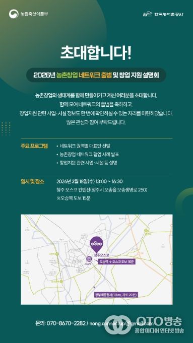 oto방송 김민석 기자 | 농림축산식품부는 3월 18일 농촌 활력 증진과 농촌 자원을 활용한 창업을 지원하기 위한 '농촌창업 네트워크'를 공식 출범하고, 농촌창업 관련 지원사업 정보를 종합적으로 안내하는 설명회를 개최한다고 밝혔다.