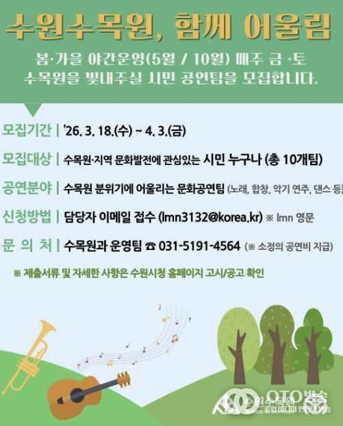 oto방송 김민석 기자 | 수원특례시가 수원수목원에서 열리는 시민 참여 문화공연 ‘수원수목원, 함께 어울림’에 참여할 시민 공연팀을 4월 3일까지 모집한다.