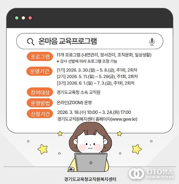 oto방송 김민석 기자 | 경기도교육청교직원복지센터가 교직원의 정서 회복과 자기 돌봄 역량 강화를 위해 녪년 상반기 온마음 교육 프로그램’를 운영한다.