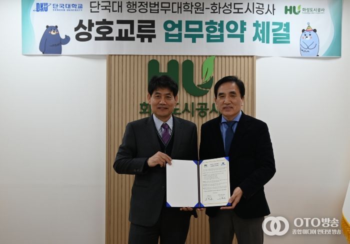 oto방송 김민석 기자 | 화성도시공사는 단국대학교 행정법무대학원과 13일 오전 상호 유기적인 협력체계를 구축해 인재 양성을 도모하기로 합의했고, 업무협약을 체결했다고 밝혔다. 양 기관은 관내 공공 행정 전문가를 양성하는데 주력할 예정이다.