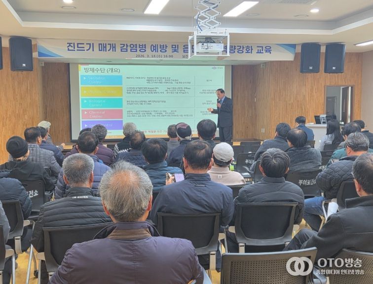oto방송 김민석 기자 | 부여군은 지난 18일 부여군보건소에서 읍면 방역 담당자와 자율방역단 등 70여 명을 대상으로 진드기매개감염병 및 방역소독에 대한 이해를 주제로 역량 강화교육을 진행했다.
