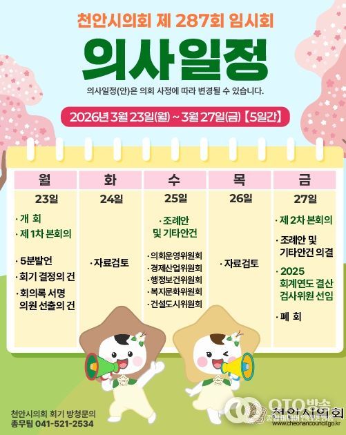 oto방송 김민석 기자 | 천안시의회가 오는 3월 23일부터 27일까지 5일간의 일정으로 제287회 임시회를 운영한다.