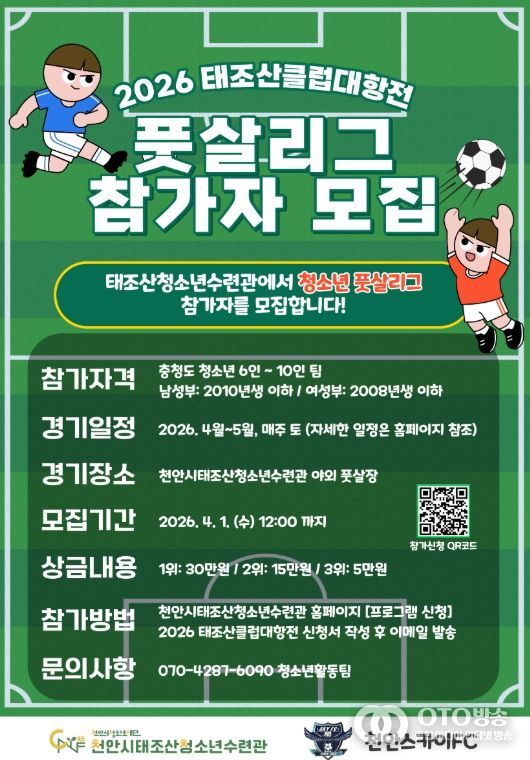 oto방송 김민석 기자 | 천안시청소년재단 산하 천안시태조산청소년수련관은 청소년의 건강한 여가 활동과 스포츠 참여 기회를 확대하기 위해 ‘2026 태조산 클럽대항전 풋살리그’ 참가팀을 모집한다고 20일 밝혔다.