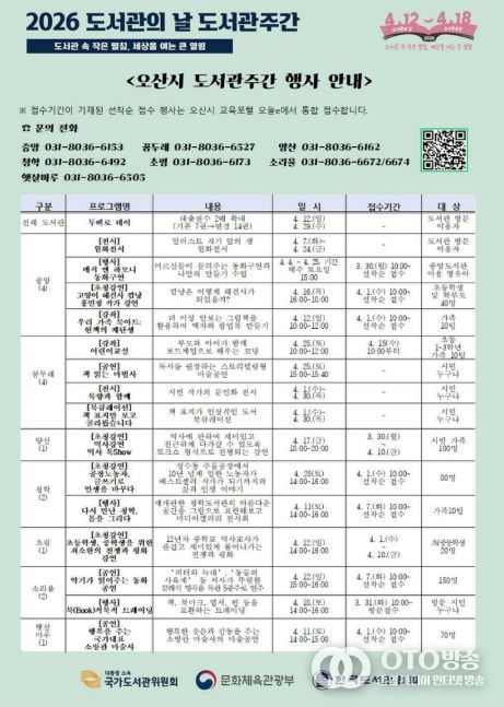 oto방송 김민석 기자 | 오산시는 2026년 도서관의 날(4월 12일)과 도서관주간(4월 12일~4월 18일)을 맞아 시민 누구나 참여할 수 있는 다양한 독서문화 행사를 운영한다고 밝혔다.
