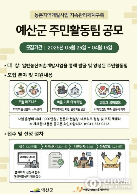 oto방송 김민석 기자 | 예산군행복마을지원센터는 주민의 지역개발사업 참여를 확대하고 주민활동팀의 자립체계 구축을 지원하기 위해 ‘농촌지역개발사업 지속관리체계 구축’ 주민활동팀을 4월 13일까지 모집한다고 밝혔다.
