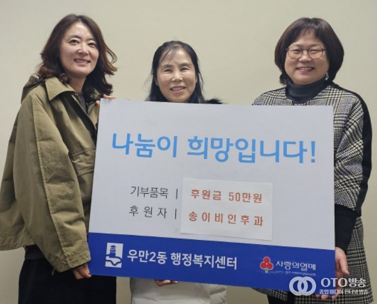 oto방송 김민석 기자 | 수원시 팔달구 우만2동은 지난 24일, 송이비인후과으로부터 취약계층 지원을 위한 이웃돕기 후원금 50만 원을 기탁받았다고 밝혔다.