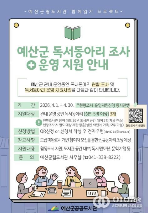 원활한 실태 파악을 위해 현황조사에 참여하는 독서동아리에는 2026년 동안 예산군립도서관 공간을 3회 무료로 대여할 수 있는 혜택을 제공한다.