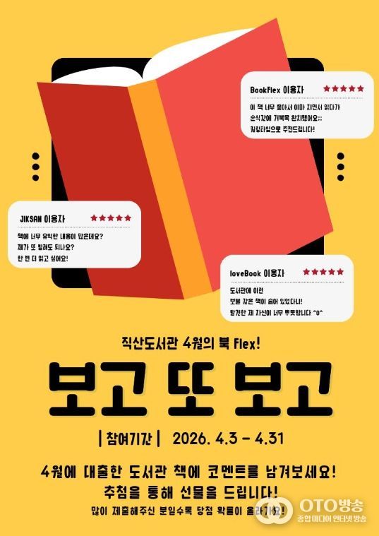 oto방송 김민석 기자 | 천안시 직산도서관은 4월 ‘북 플렉스(Flex)’ 프로그램으로 ‘보고 또 보고’를 운영한다고 2일 밝혔다.