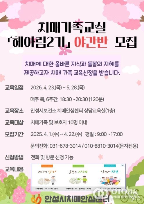 oto방송 김민석 기자 | 안성시보건소 치매안심센터가 직장이나 생업으로 낮시간대 교육받기 어려운 치매환자 가족을 위하여 오는 23일부터 가족교실 야간반을 운영한다.