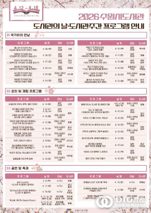 ‘아트 인사이드(창룡·광교홍재도서관, 4월 9~17일)’, ‘사계-봄 축제(호매실도서관, 4월 18일)’ 등 6개의 공연·축제가 열린다. ‘이진아 작가와의 만남(호매실도서관, 4월 15일)’, ‘예소연 작가와의 만남(선경도서관, 4월 16일)’ 등 12개의 저자 초청 강연도 열린다.