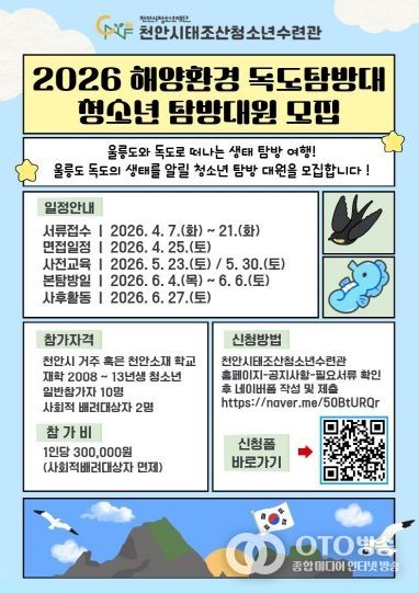 oto방송 김민석 기자 | 천안시청소년재단 산하 천안시태조산청소년수련관은 지역 청소년을 대상으로 ‘2026 해양환경 독도탐방대’ 참가자를 모집한다고 7일 밝혔다.