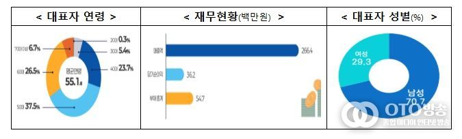 대표자 연령은 평균 55.1세, 성별은 남성 70.7%, 여성 29.3%로 조사됐으며, 기업당 평균 매출액은 266.4백만원, 당기순이익은 36.2백만원으로 나타났다.