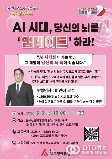 oto방송 김민석 기자 | 오산시는 오는 5월 8일 오전 10시 오산AI코딩에듀랩에서 『AI시대, 당신의 뇌를 ‘업데이트’하라!』를 주제로 명사 초청 디지털 AI 시민 특강을 개최한다고 밝혔다.