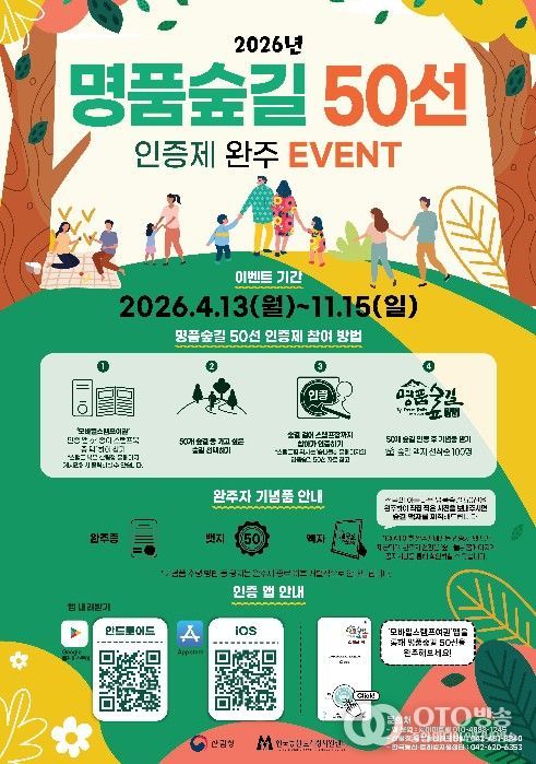 oto방송 김민석 기자 | 산림청은 숲길을 활용한 국민의 여가 활성화 및 지역경제 활성화를 위해 ‘2026년 명품숲길 50선 완주 인증제’를 11월 15일까지 운영한다고 13일 밝혔다.