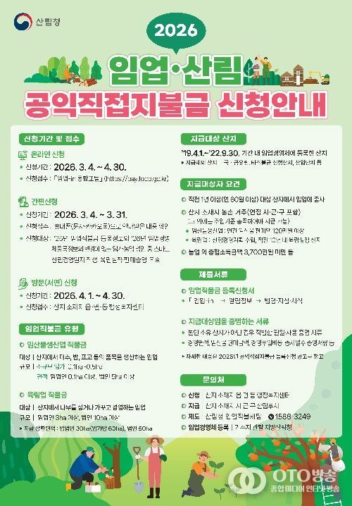 oto방송 김민석 기자 | 산림청은 2026년 임업·산림 공익직접지불금(임업직불금) 신청・접수가 4월 30일에 마감됨에 따라, 아직 임업직불금을 신청하지 않은 임업인들에게 기한 내 신청접수를 완료해 달라고 15일 당부했다.