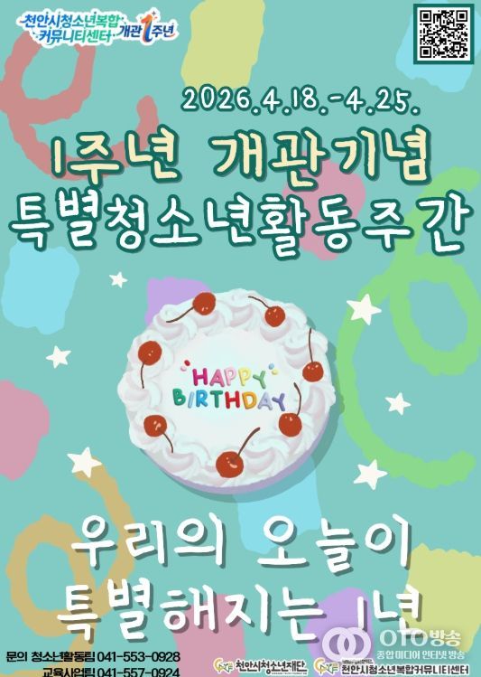 oto방송 김민석 기자 | 천안시청소년재단 산하 천안시청소년복합커뮤니티센터는 개관 1주년을 맞아 오는 18일부터 25일까지 ‘특별청소년활동체험주간’을 운영한다고 17일 밝혔다.