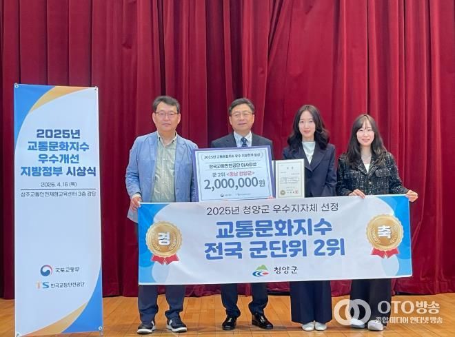 oto방송 김민석 기자 | 청양군이 한국교통안전공단 주관 ‘2025년 교통문화지수 실태조사’에서 전국 80개 군 지역 중 2위(A등급)를 차지하며 명실상부한 교통안전 선도 도시로 우뚝 섰다.