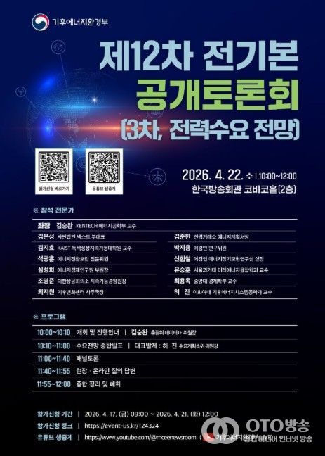 기후에너지환경부와 12차 전기본 수립 총괄위원회는 4월 22일 10시부터 서울 양천구 소재 한국방송회관 코바코홀(2층)에서 3차 대국민 정책토론회를 개최한다고 밝혔다.