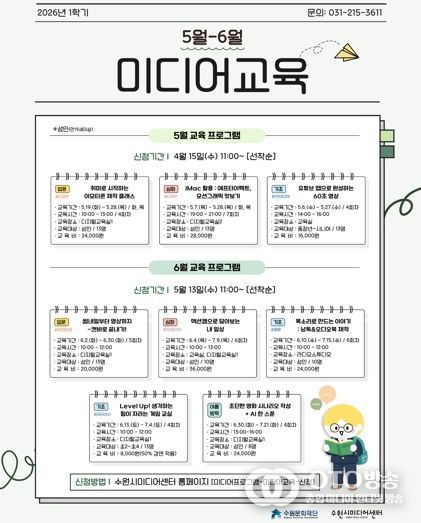또한, 학기제 교육 프로그램으로는 5월 ▲취미로 시작하는 이모티콘 제작 클래스 ▲IMac 활용 : 애프터이펙트, 모션그래픽 맛보기 등 디자인 중심 교육이 개설되며, 6월에는 ▲썸네일부터 영상까지 캔바로 끝내기! ▲액션캠으로 담아보는 내 일상 등 1인 미디어를 주제로 한 교육을 개설한다. 월별 프로그램 접수일과 프로그램별 수강료가 상이하므로 사전 확인이 필요하다. 미디어 교육 프로그램에 관한 상세 정보 및 교육 신청은 수원시미디어센터 홈페이지를 통해 확인할 수 있다.