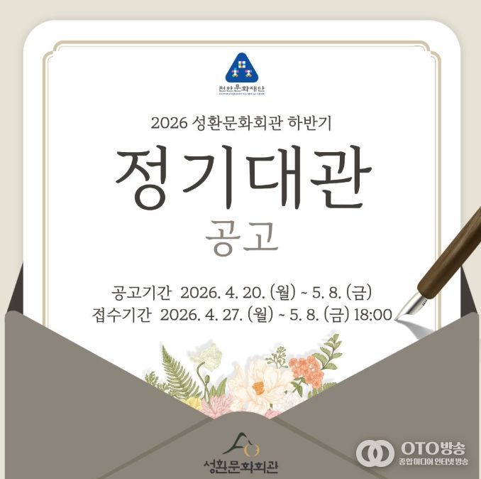 oto방송 김민석 기자 | 천안문화재단은 이달 27일부터 내달 8일까지 성환문화회관 대·소공연장 하반기 정기대관 공모 접수를 진행한다고 20일 밝혔다.
