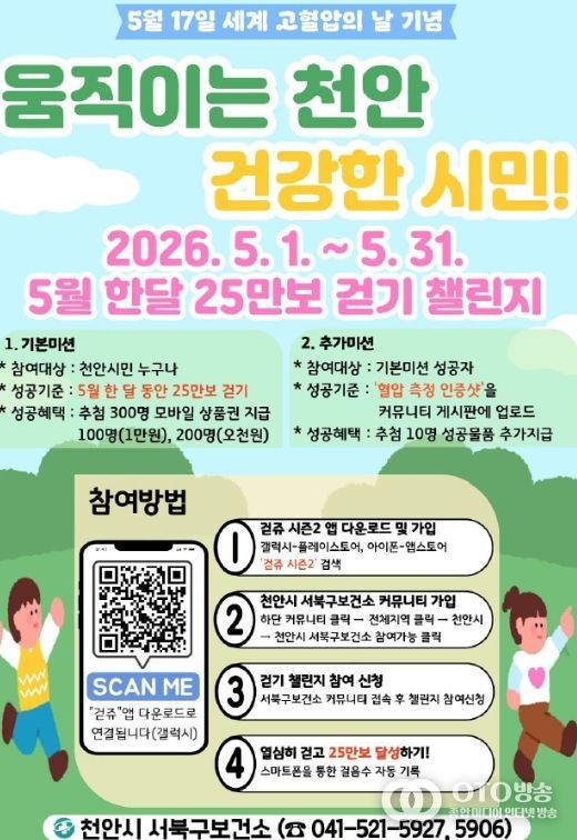 oto방송 김민석 기자 | 천안시 서북구보건소는 5월 한 달간 ‘움직이는 천안, 건강한 시민!’ 걷기 챌린지를 운영한다고 20일 밝혔다.