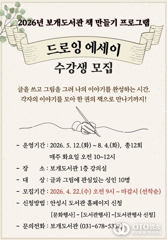 oto방송 김민석 기자 | 안성시 보개도서관(책문화센터)이 시민들의 창작 활동을 지원하고 일상 속 예술 경험을 확대하기 위해 오는 5월부터 ‘드로잉 에세이’와 ‘포토 에세이’ 책 만들기 프로그램을 새롭게 운영한다고 밝혔다.