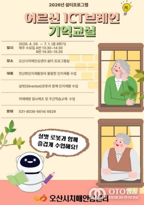 oto방송 김민석 기자 | 오산시치매안심센터는 오는 4월 29일부터 경증 치매환자를 위한 쉼터 프로그램 ‘ICT 브레인 기억 교실’을 운영한다고 밝혔다.