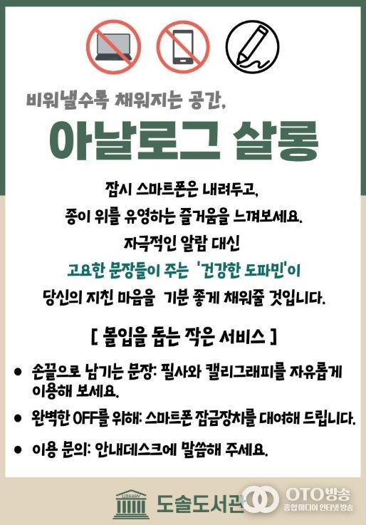 oto방송 김민석 기자 | 천안시 도솔도서관은 디지털 피로를 해소하기 위한 디지털 디톡스 프로그램을 운영한다고 21일 밝혔다.