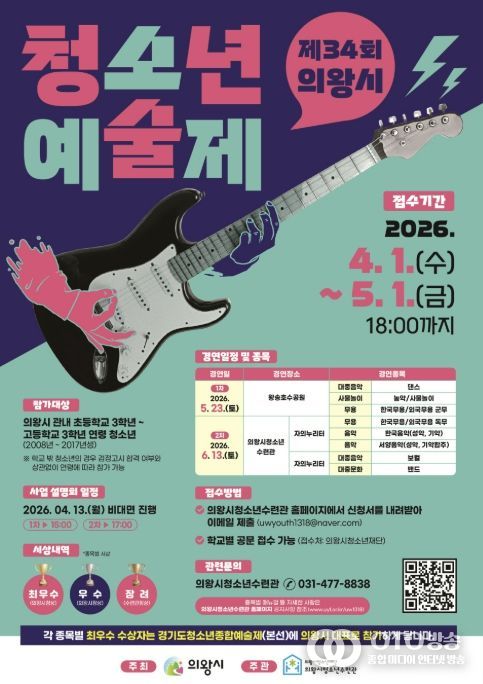 장원호 의왕시청소년예술제 담당자는 “청소년들이 주도적으로 참여하는 예술 활동을 통해 자신의 재능을 마음껏 펼칠 수 있는 기회가 되길 바란다”며 “관내 청소년들의 많은 관심과 참여를 기대한다”고 전했다.
