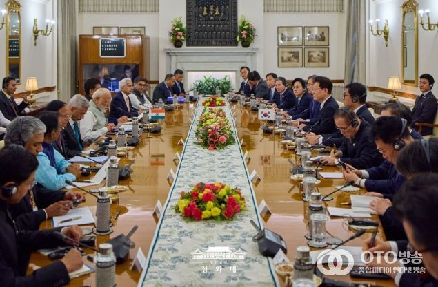 이 대통령은 인도의 인구와 GDP 규모에 비해 우리 교민 수는 1만 2000명, 우리 진출 기업 수는 670여 개 정도로 한-인도 관계가 정체돼 있다면서, 이번 회담을 통해 민간 교류, 경제 협력, 안보 협력 등 지금과는 차원이 다른 협력을 해 나가자고 했다.