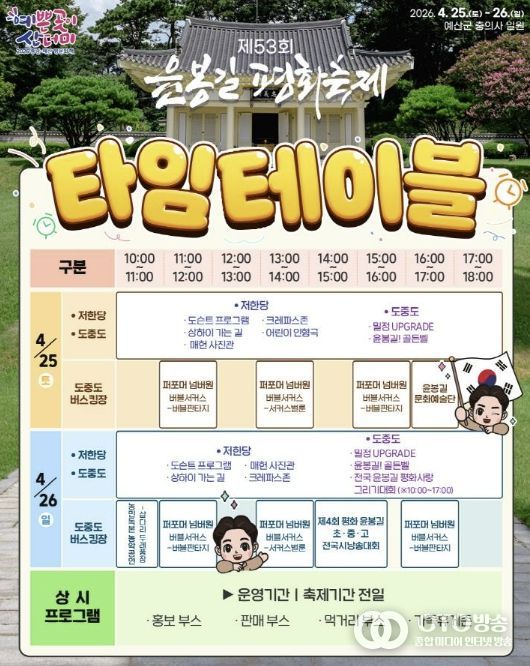 oto방송 김민석 기자 | 예산군은 ‘제53회 윤봉길 평화축제’를 오는 4월 25일부터 26일까지 덕산면 충의사 일원에서 개최한다고 밝혔다.