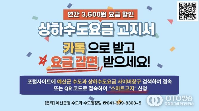 oto방송 김민석 기자 | 예산군은 수도요금을 카카오톡 알림톡으로 간편하게 확인하고 납부할 수 있는 ‘스마트고지 서비스’ 이용을 늘리기 위해 홍보를 강화한다고 밝혔다.
