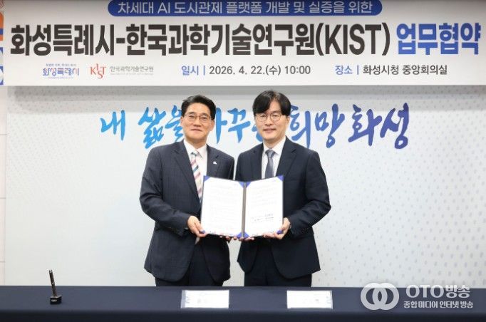 oto방송 김민석 기자 | 화성특례시는 도시상태정의 기반의 AI 도시관제 체계로의 전환에 본격 착수했다. 시는 22일 한국과학기술연구원(KIST)과 ‘차세대 AI 도시관제 플랫폼 개발 및 실증’을 위한 업무협약(MOU)을 체결했다.