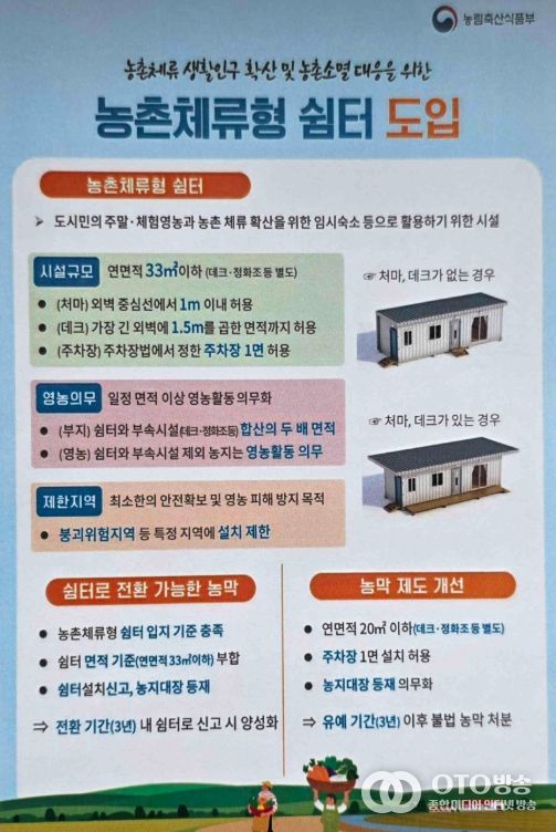 농촌체류형 쉼터는 농촌 생활인구 확산과 농촌 소멸 대응을 위해 도입된 제도로, 농업경영의 편의를 높이고 영농의 효율성을 높이는 데에도 의미가 있다.