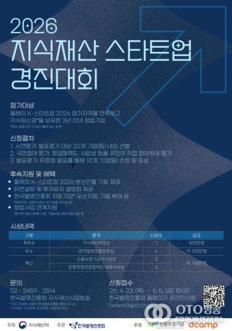 oto방송 김민석 기자 | 지식재산처는 신용보증기금, 은행권청년창업재단(디캠프), 한국발명진흥회와 함께 4월 23일 ~ 6월 5일까지'2026 지식재산 스타트업 경진대회'참가기업을 모집한다고 밝혔다.