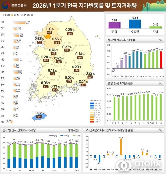 oto방송 김민석 기자 | 국토교통부와 한국부동산원(원장 이헌욱)은 '26년 1분기 지가변동률 및 토지거래량을 발표했다.