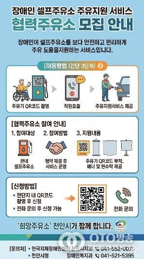 oto방송 김민석 기자 | 천안시가 장애인의 셀프주유소 이용 불편을 해소하기 위해 ‘장애인 편의 제공 셀프주유소’ 참여 업체를 모집한다고 24일 밝혔다.