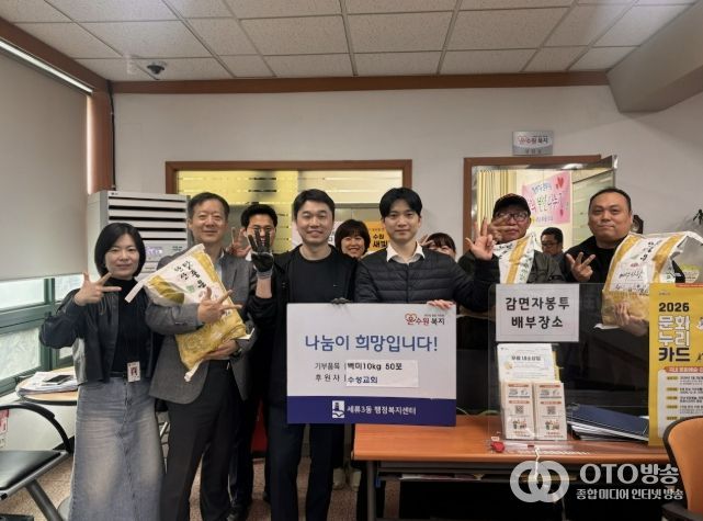 oto방송 김민석 기자 | 수원시 권선구 소재 수성교회는 세류3동행정복지센터에 쌀 50포를 기부하며, 지역 내 어려운 이웃을 위한 따뜻한 나눔을 실천했다.