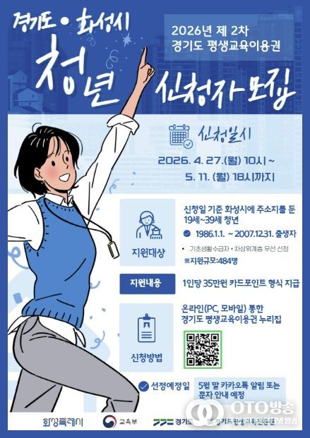 oto방송 김민석 기자 | 화성특례시는 청년층의 자기계발과 역량 강화를 지원하기 위해 ‘2026년 평생교육이용권 지원사업’ 지역특화(청년) 분야 2차 이용자를 모집한다고 밝혔다.