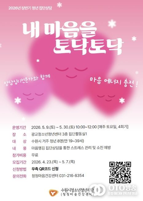 oto방송 김민석 기자 | 수원시청소년청년재단 청청마음건강센터는 학업과 취업준비, 직장생활 등 경쟁 중심 환경으로 인해 심리적 소진을 겪는 관내 청년들을 대상으로, 오는 5월 7일까지 전문가가 참여하는 집단상담 프로그램 ‘내 마음을 토닥토닥’ 참가자를 모집한다고 밝혔다.