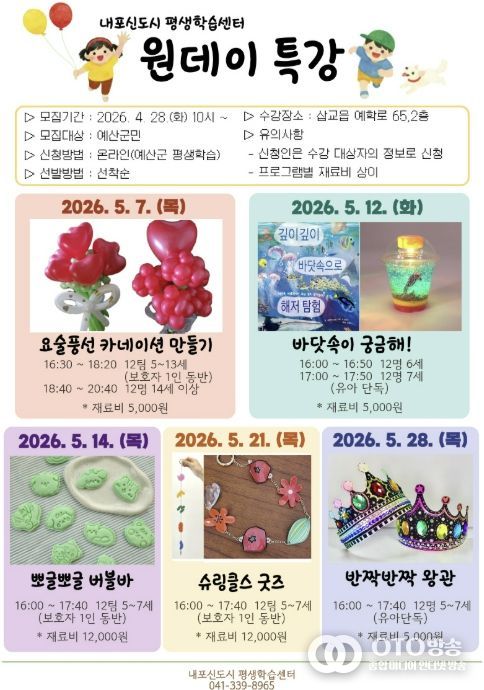 oto방송 김민석 기자 | 예산군 내포신도시 평생학습센터는 5월을 맞아 지역 어린이를 위한 체험형 원데이 특강 프로그램을 운영한다.