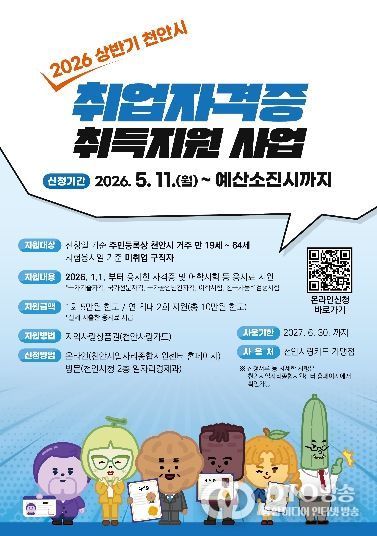 oto방송 김민석 기자 | 천안시가 구직자의 경제적 부담을 완화하고 취업 역량 강화를 돕기 위해 ‘2026년 상반기 취업자격증 취득지원 사업’ 참가자를 모집한다고 27일 밝혔다.